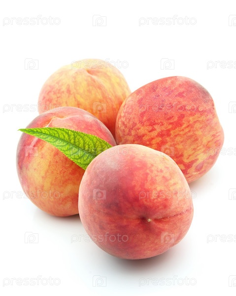 Четыре спелых персика на белом фоне