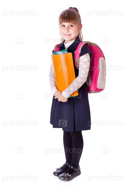 Школьница с папками в руках. Изолирована на белом