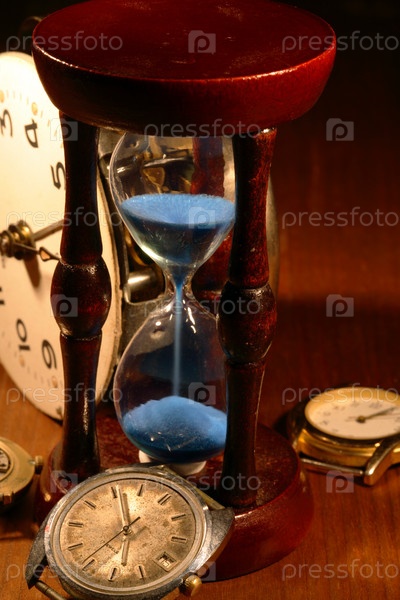 Песочные часы, старые часы и часовой механизм на деревянном фоне