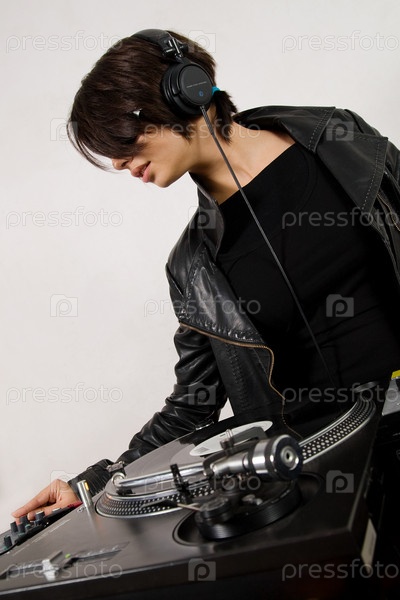 Молодая привлекательная девушка воспроизводит музыку с виниловых пластинок