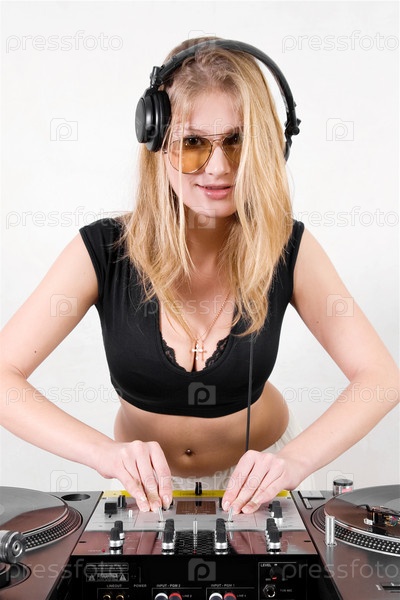 Блондинка в наушниках смешивает музыку на профессиональном оборудовании