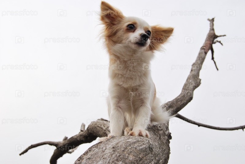 Собачка породы чихуахуа на высохшем дереве