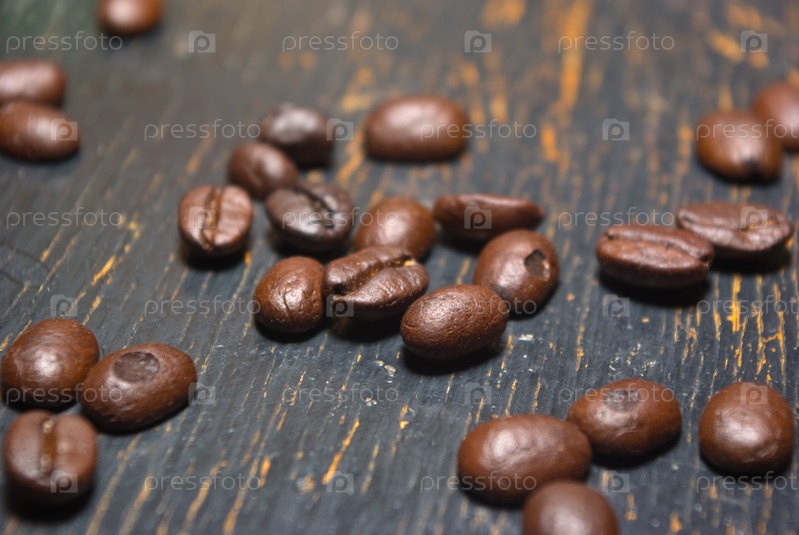 Жареные кофейные зерна на деревянном фоне