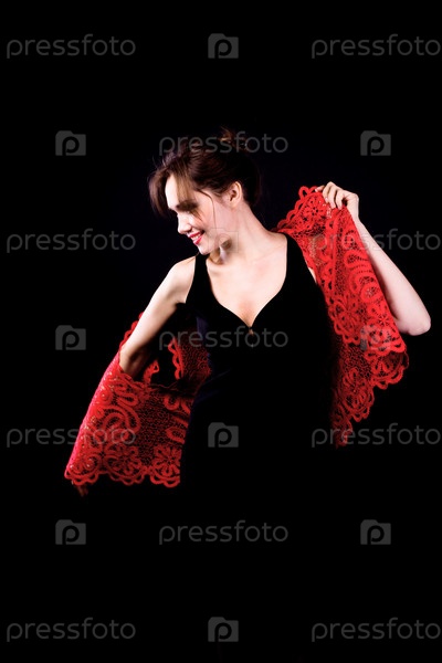 Женщина в черном платье с красной накидкой