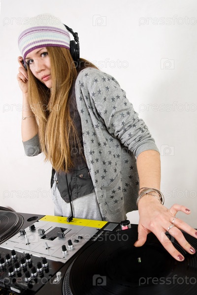 Девушка в наушниках за диджейской установкой