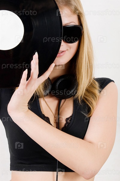 Блондинка в темных очках и с наушниками позирует с виниловой пластинкой