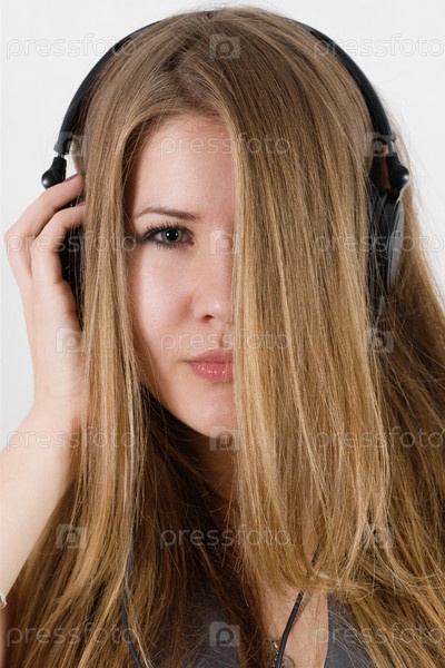 Привлекательная блондинка в наушниках с пристальным взглядом