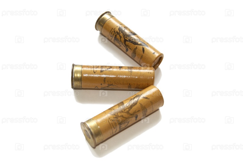Три патрона для охотничного ружья на белом фоне