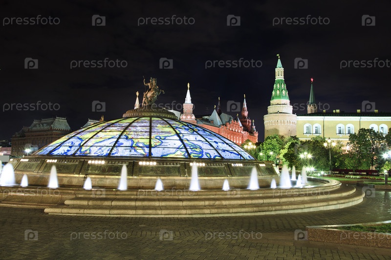 Вечерний вид на Манежную площадь, фонтан "Часы Мира" и Московский Кремль