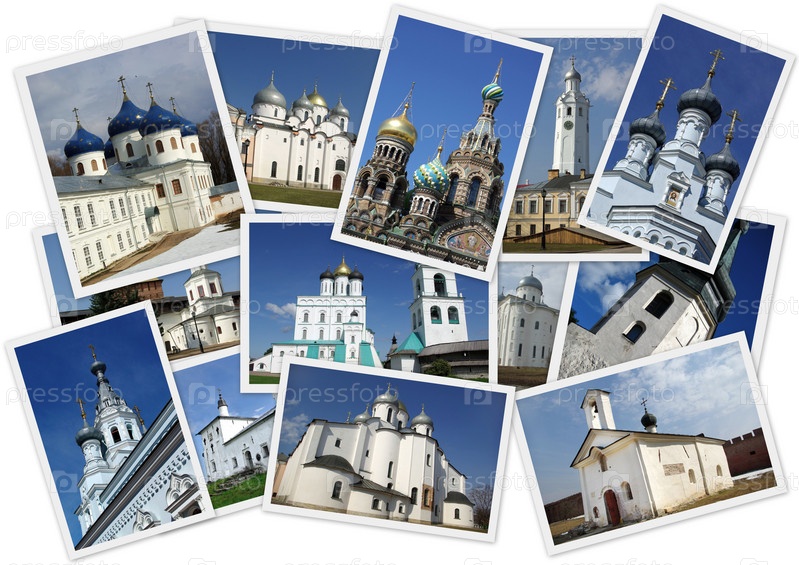 Коллаж с несколькими фотографиями православных церквей России на белом фоне