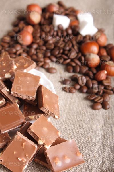 Шоколад, кофейные зерна и фундук
