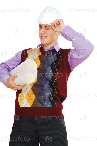 Молодой мужчина в строительной каске на белом фоне