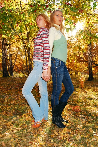Две молодые девушки, стоящие в осеннем лесу спинами друг к другу