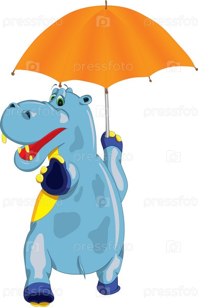Веселый бегемот идет с зонтом