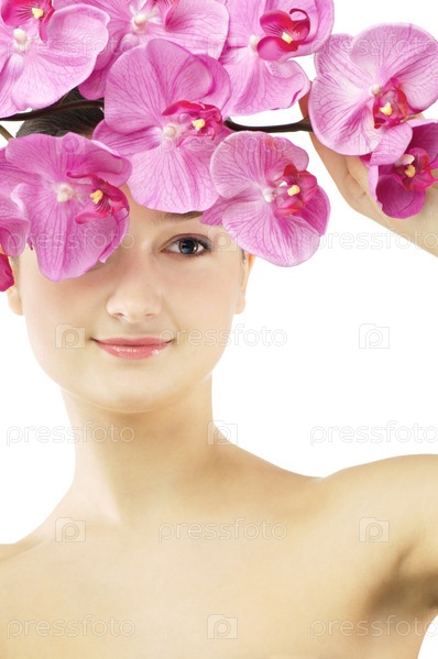 Портрет девушки с цветами на белом фоне