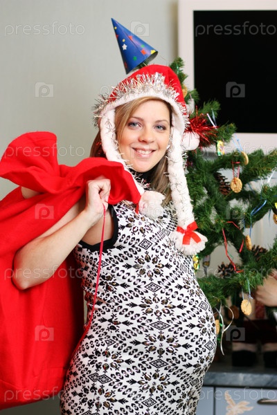 Беременная женщина с новогодним мешком