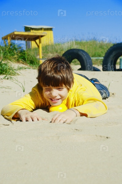 Мальчик лежит на пляже