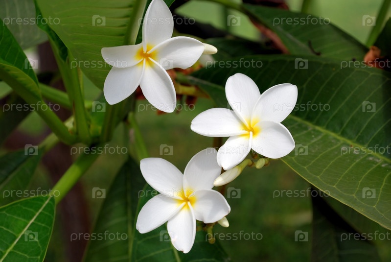 Белые цветы и зеленые листья в тропическом саду