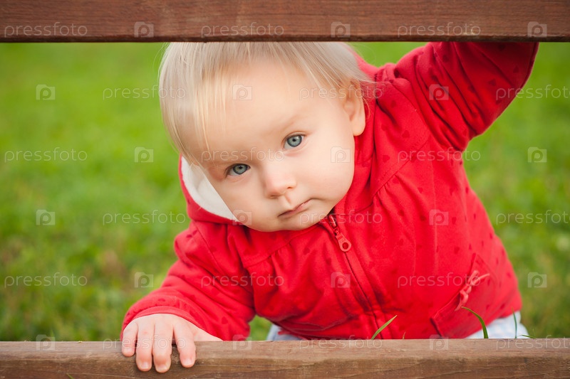 Маленькая девочка у деревянного забора в парке