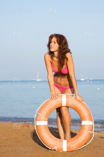 Красивая девушка стоит на морском берегу, опираясь на спасательный круг