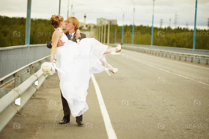Жених несет невесту на руках и целует ее