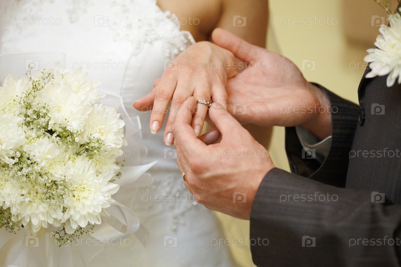 Жених одевает кольцо на палец невесты
