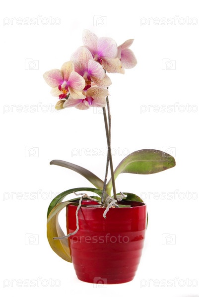 Розовая орхидея в горшке на белом фоне