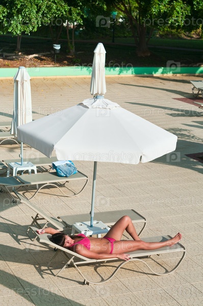 Красивая девушка загорает возле бассейна отеля под зонтиком