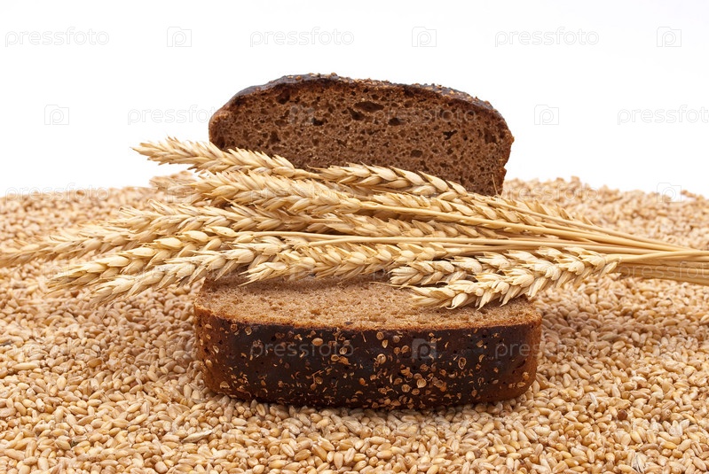 Колосья пшеницы и черный хлеб на зернах