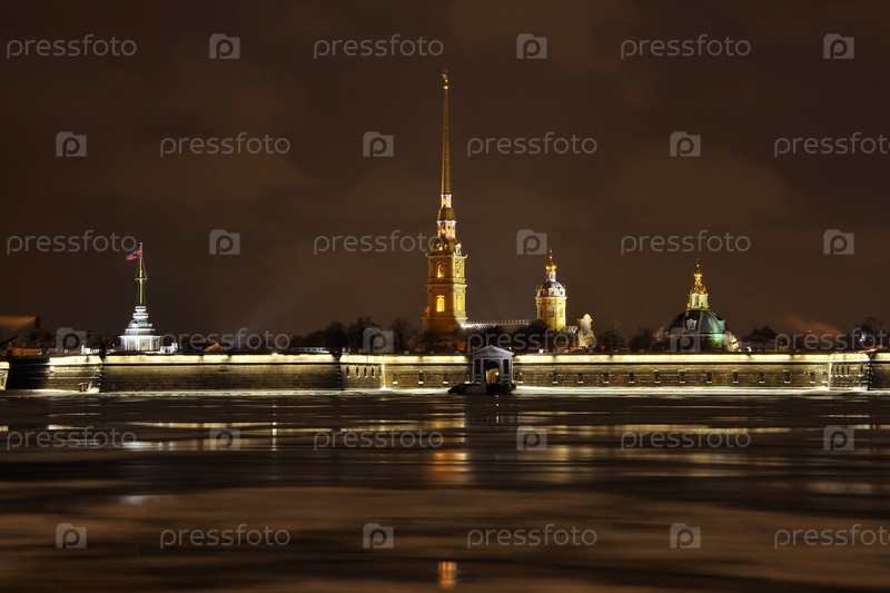 Петропавловская крепость ночью в свете фонарей, зима, Санкт-Петербург
