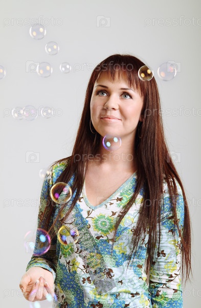 Девушка и мыльные пузыри на сером фоне
