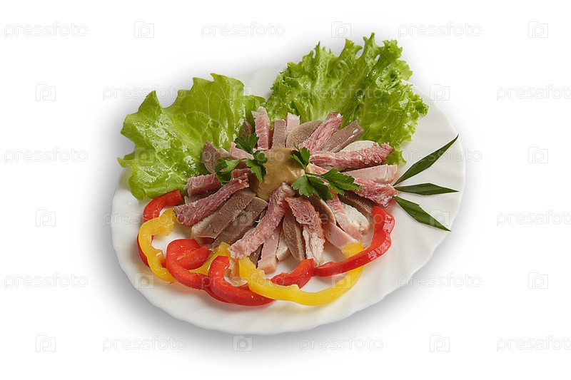 Мясное ассорти с горчицей и овощами на тарелке