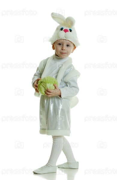 Маленький мальчик в костюме зайца держит кочан капусты в руках