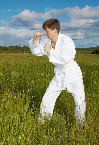 Молодой человек, занимающийся каратэ на открытом воздухе