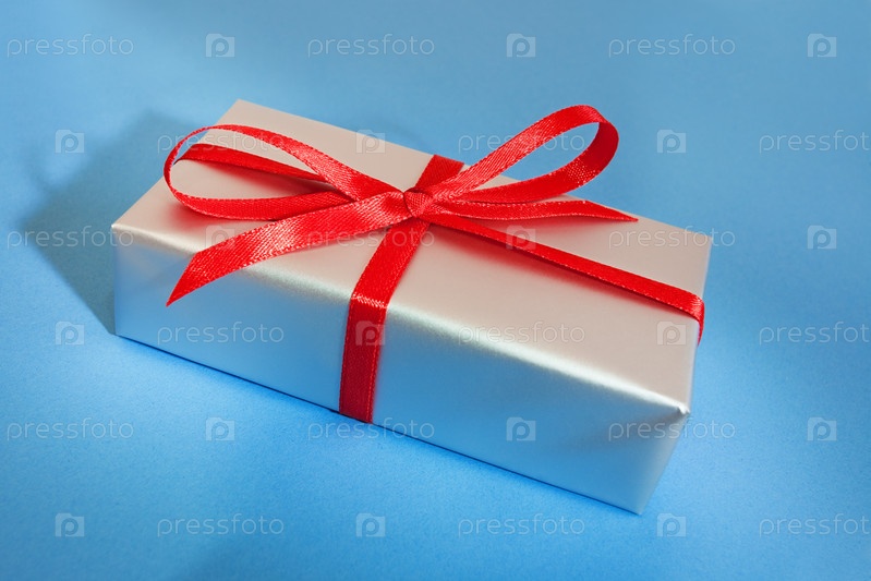 Серебряная коробка с красным бантом на голубом фоне