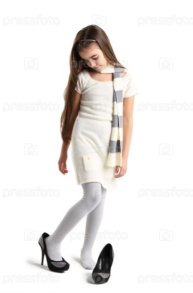 Маленькая девочка примеряет женскую туфлю на высоком каблуке