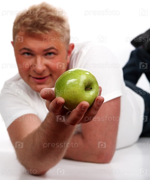 Взрослый мужчина держит яблоко