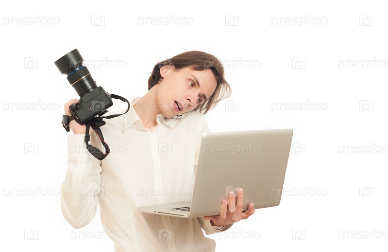 Профессиональный фотограф разговаривает по телефону, держа камеру и ноутбук
