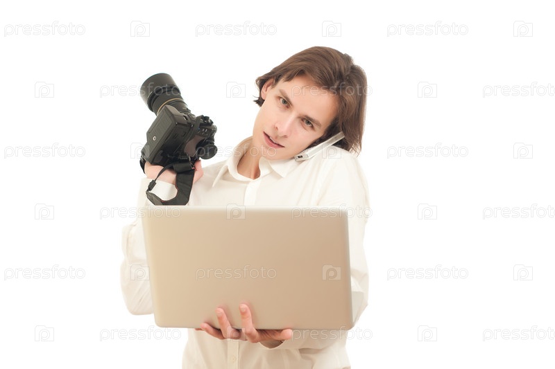 Профессиональный фотограф разговаривает по телефону, держа камеру и ноутбук