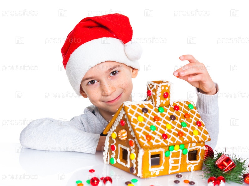 Мальчик в шапке Санта-Клауса с пряничным домом