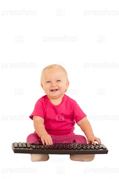 Маленький ребенок, сидящий с клавиатурой от компьютера на белом фоне