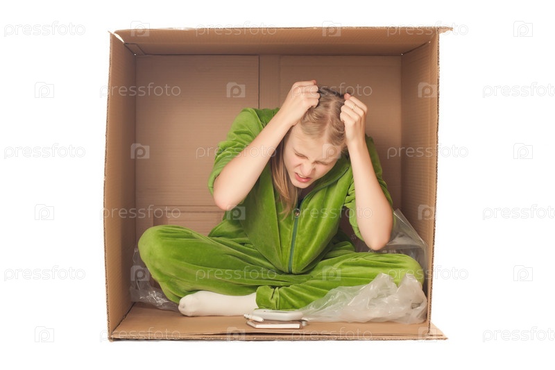 Расстроенная девушка сидит в картонной коробке