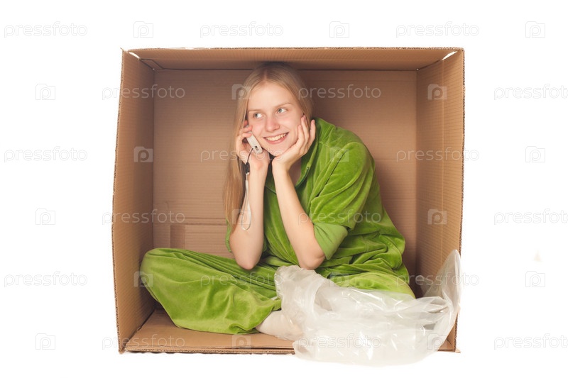 Девушка разговаривает по телефону, сидя в картонной коробке