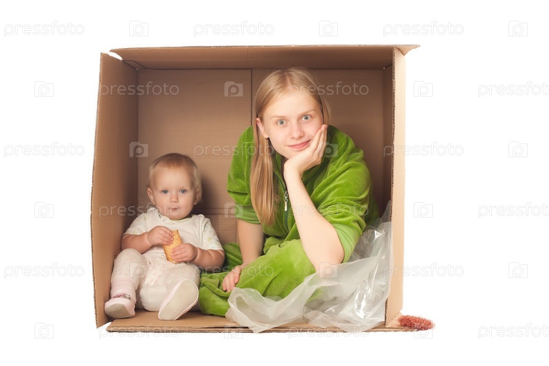 Мама с ребенком сидят в картонной коробке