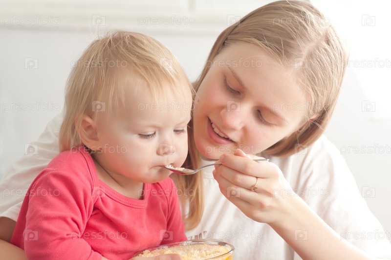 Мама кормит маленького ребенка кашей