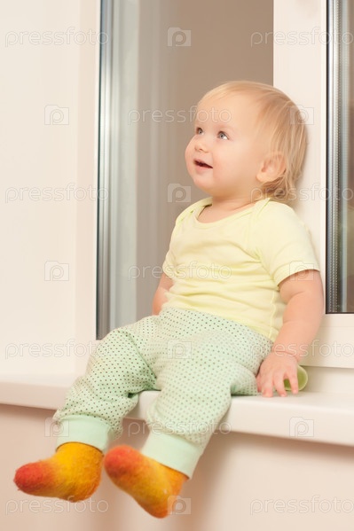 Очаровательный ребенок сидит на подоконнике