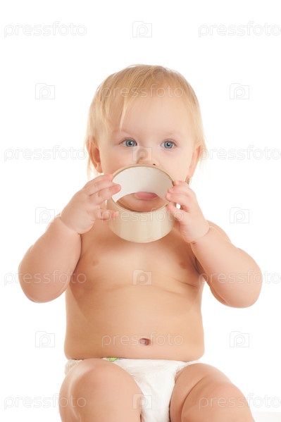 Маленький ребенок со скотчем на белом фоне