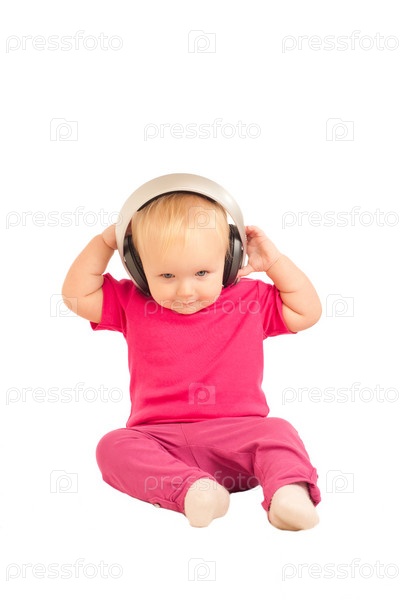 Маленький ребенок слушает музыку в наушниках