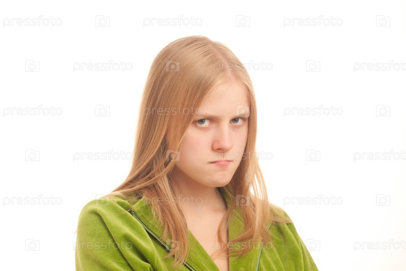 Портрет молодой сердитой девушки на белом фоне