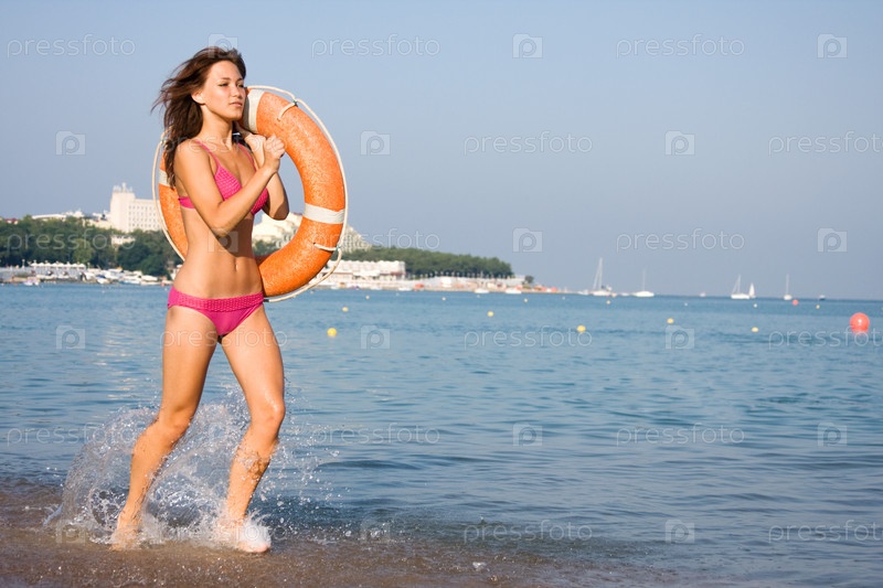 Красивая девушка со спасательным кругом бежит по пляжу